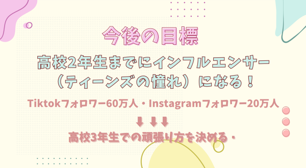 あおいさんの今の目標は、「10代の憧れ」であるインフルエンサーになり、高校2年生でTikTok60万人、Instagram20万人のフォロワーを獲得すること。その結果を受けて、高校3年生では自分の進路について改めて考えたいと思っているそうです。