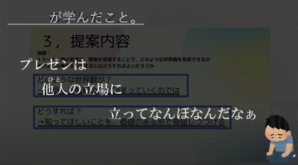 実際、大人の反応は微妙な感じだったということで、このことからM・Hくんは、プレゼンについて1つの学びを得ました。
