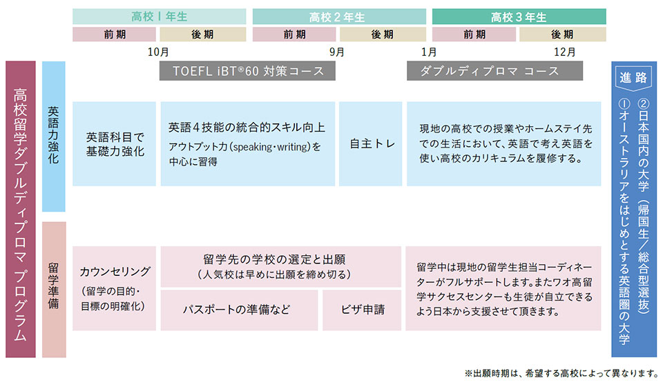 オーストラリアに留学するのは、高校2年生の1月下旬から高校3年生の12月までの1年間です。渡航までに、卒業単位科目としての「コミュニケーション英語Ⅰ」と「英語実技S(ワオ高オリジナル科目)」で英語の基礎力を整え、「TOEFLiBT® 60対策コース」(詳細はP10参照)で留学中の授業に備えたアカデミックな英語力の習得に励みます。並行して、留学先の高校の選定と対策を留学サクセスセンターのスタッフと一緒に考えます。人気校ほど早いタイミングで願書の受付を締め切るため、早ければ実際に留学する1年前から留学に関する手続きが始まると考えてください。